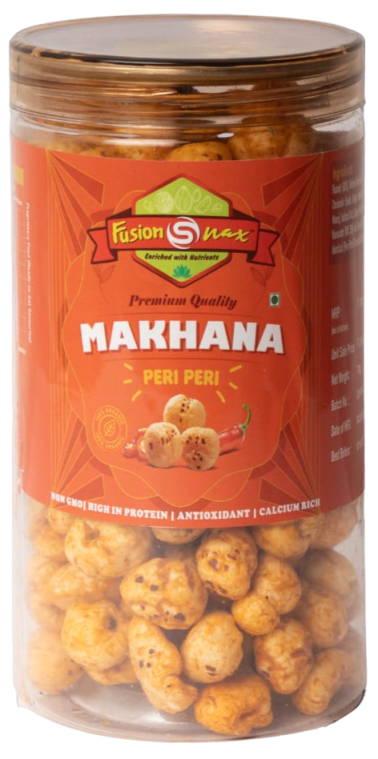 Fox Nut (70%), Refined Rice Bran Oil, Spice & Condiments (Red Chilli, Cumin, Mango Powder, Coriander Seeds, Ginger, Turmeric. Bishop's Weed, Black Pepper, Cinnamon, Fenugreek Seeds, nutmeg, Mace), lodized salt, Suagar, Maltodextrin, Hydrolysed Peanut Protein, Acidity Regulators (INS 330 and INS 296), Nausader (INS 510) and Flavour Enhancer (INS 635), Natural Colour Paprika Oleoresins (INS 160) and Nature Identical (Peri-Peri) Flavouring Substances.